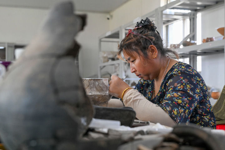 2025年5月20日,考古工作者在大汶口遗址考古工作站对出土器物进行修复。新华社记者 陈朔 摄