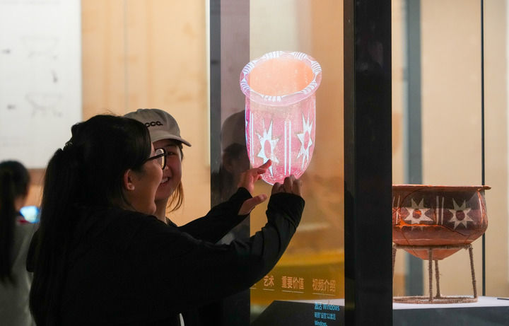 2025年5月20日,参观者在大汶口遗址博物馆内通过多媒体设备多角度观看大汶口遗址出土八角星纹彩陶豆。新华社记者 徐速绘 摄