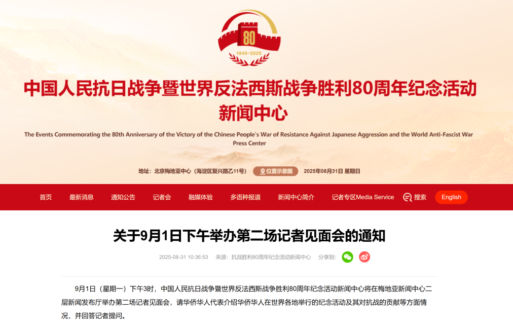9月1日(星期一)下午3时,中国人民抗日战争暨世界反法西斯战争胜利80周年纪念活动新闻中心将在梅地亚新闻中心二层新闻发布厅举办第二场记者见面会,请华侨华人代表介绍华侨华人在世界各地举行的纪念活动及其对抗战的贡献等方面情况,并回答记者提问。(记者范思翔)