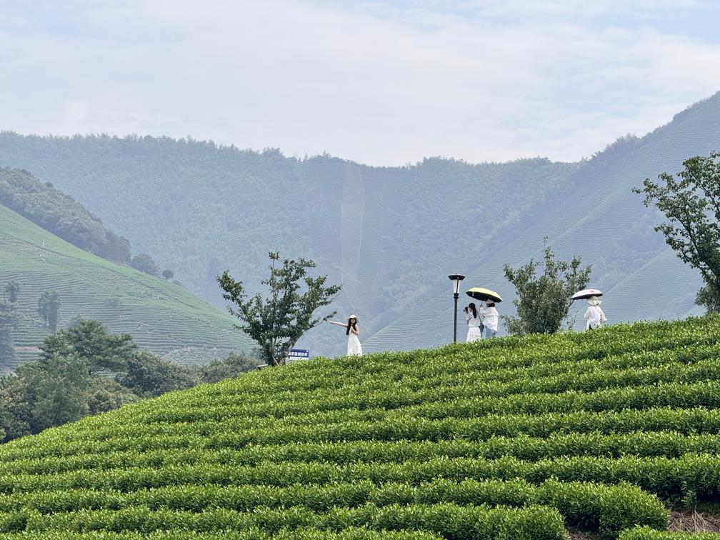 游客在浙江安吉黄杜村万亩茶园内拍照打卡。新华社记者郑可意 摄