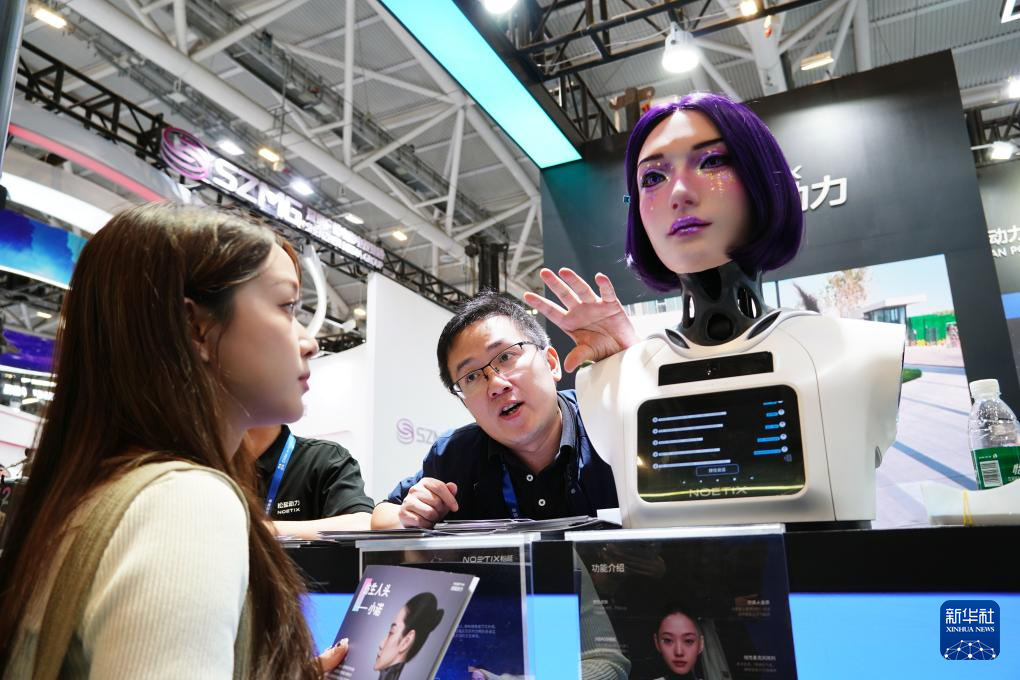 11月14日,观众在第二十七届中国国际高新技术成果交易会上了解可模仿复杂表情的仿生机器人。新华社记者 王丰 摄