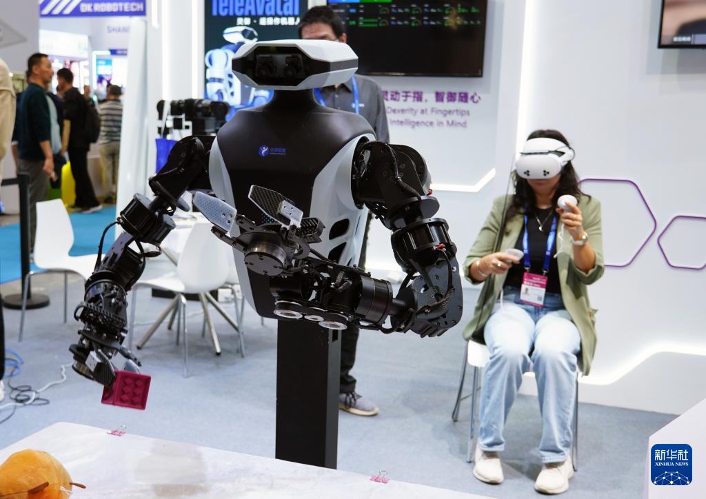 11月14日,观众在第二十七届中国国际高新技术成果交易会上操控机器人拿起物体。新华社记者 王丰 摄