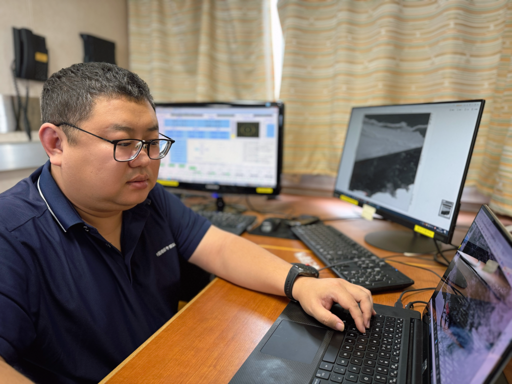船时11月29日深夜,随船卫星保障人员、国家卫星海洋应用中心工程师纪元在电脑前接收中国“1米C-SAR卫星01”与“02星”数据,第一时间处理转化,并最终形成高分辨率卫星数据图片。