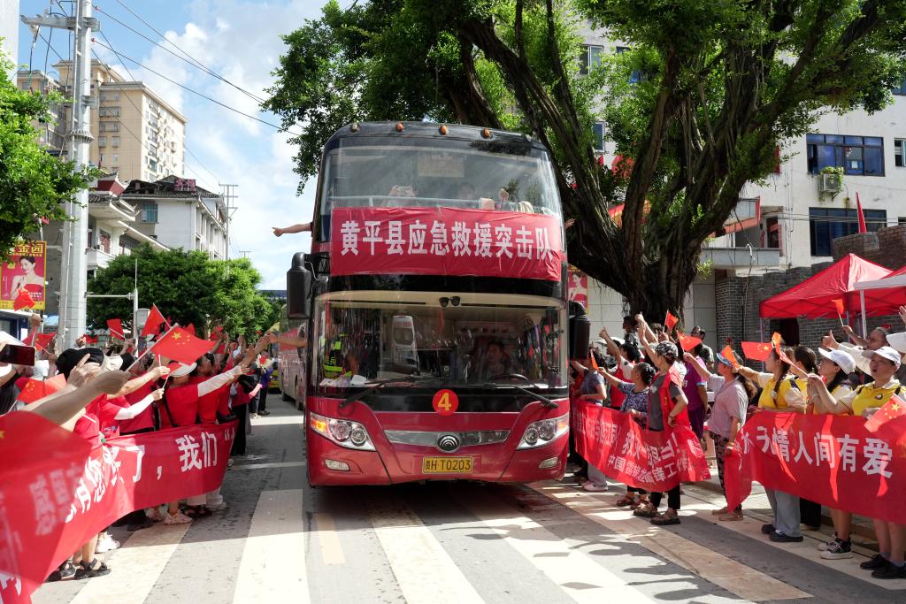 ↑7月3日,在贵州榕江县城,当地居民沿街送别救援队员。