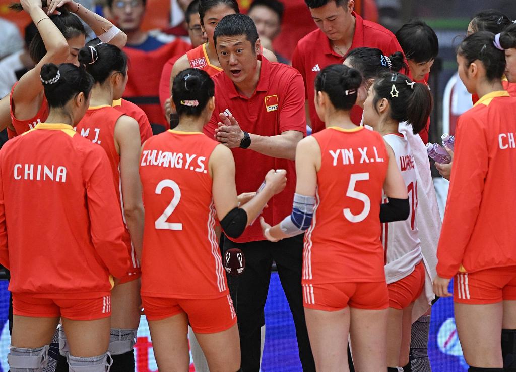 8月31日,中国队主教练赵勇(中)在2025年世界女排锦标赛八分之一决赛比赛间隙指导球员。新华社记者 侯昭康 摄