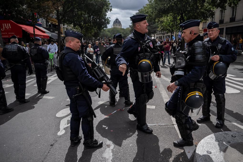 9月10日,警察在法国巴黎夏特莱广场附近的游行示威现场警戒。新华社发(奥雷利安·莫里萨尔摄)