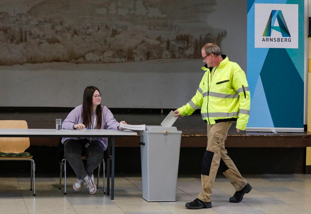 2月23日,德国新一届联邦议院选举投票开始。图为在德国北莱茵-威斯特法伦州阿恩斯贝格,选民在一处投票站投票。新华社记者 张帆 摄