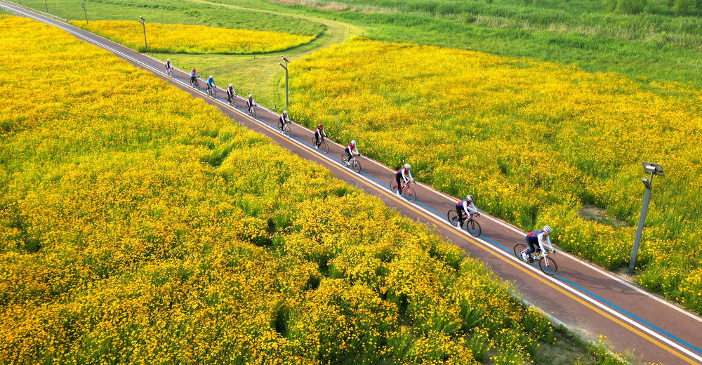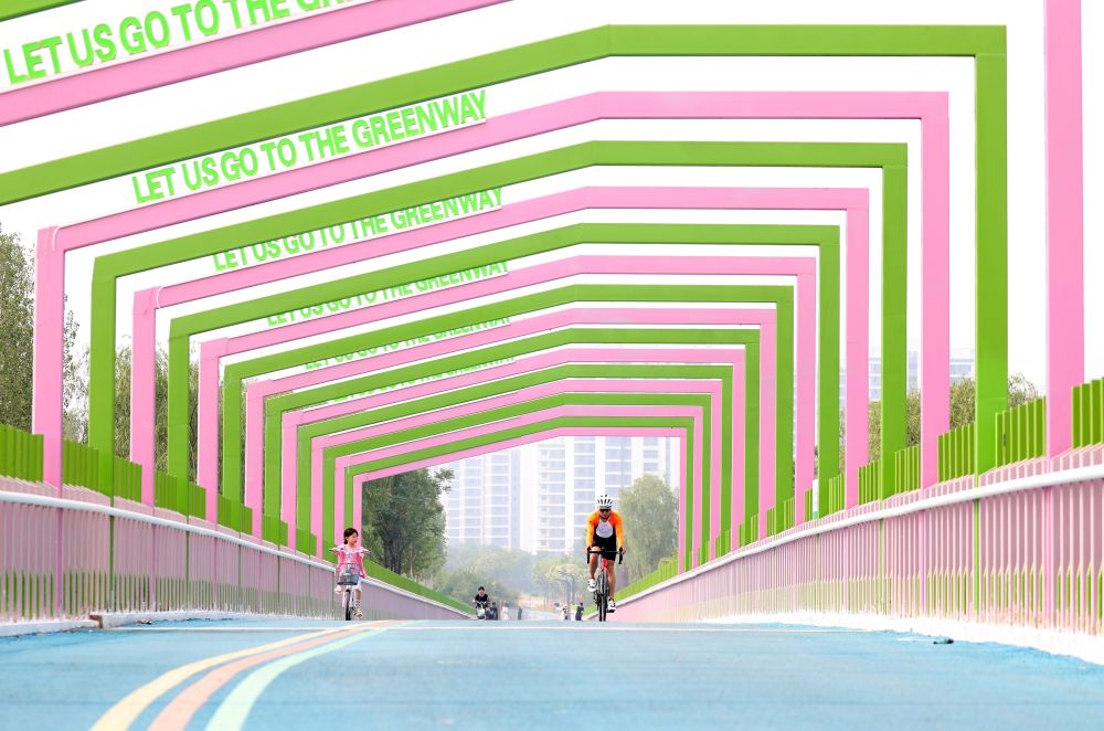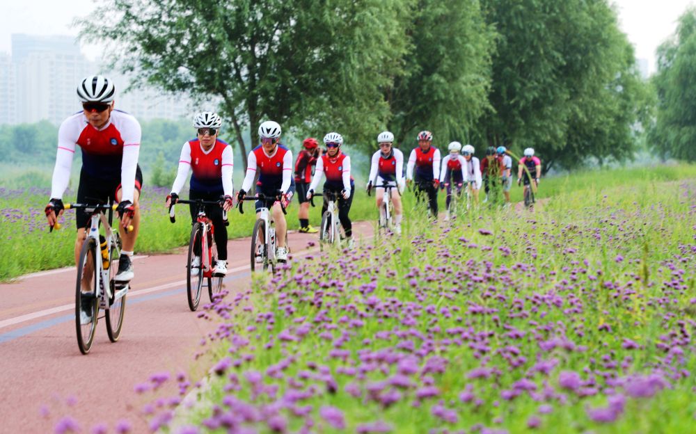 ↑7月10日,骑行爱好者在河北省石家庄市环城绿道东线骑行健身。