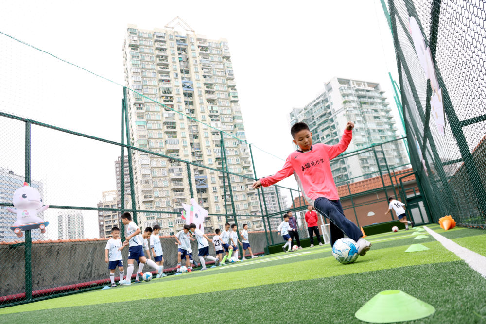 ↑11月3日,广州市永曜北小学的学生在学校楼顶天台的足球场踢球。