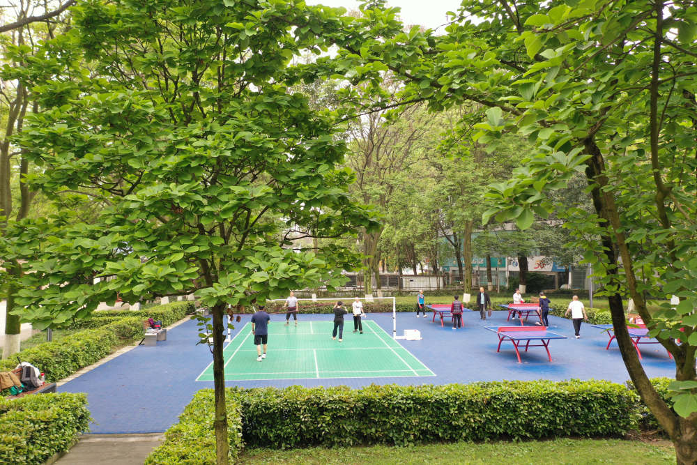 ↑4月13日,在四川省眉山市东坡区苏轼公园内一处“口袋球场”,市民在打乒乓球、羽毛球(无人机照片)。