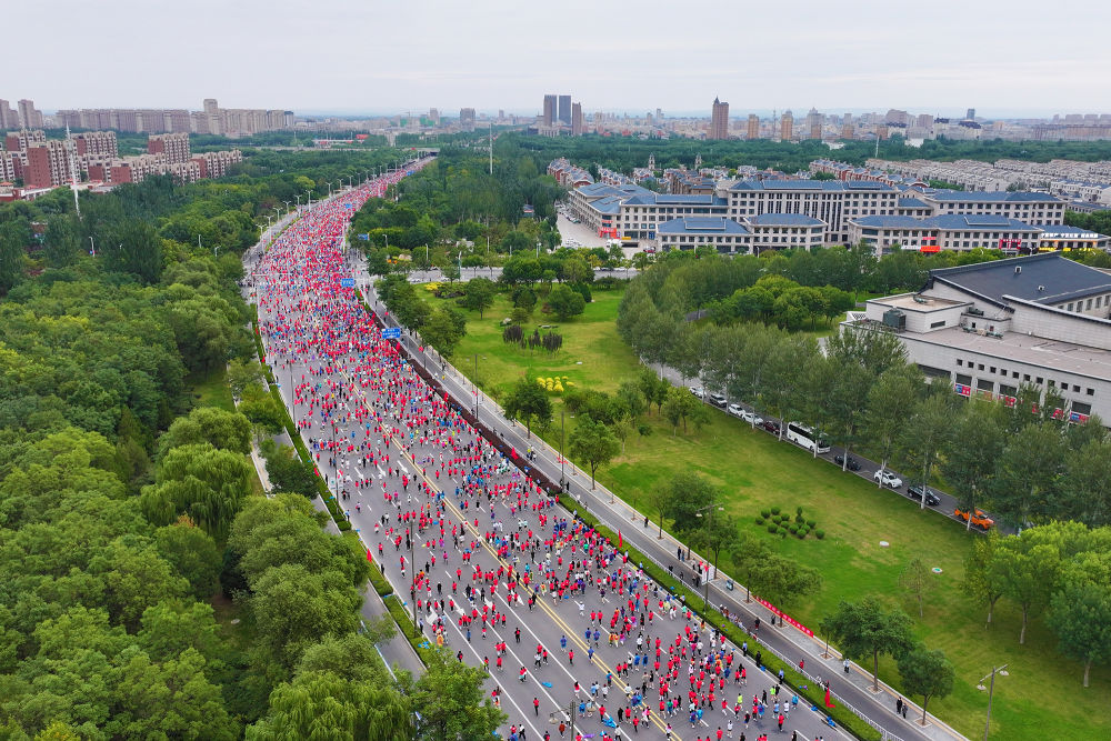 ↑9月21日,选手们在2025宁夏黄河金岸(吴忠)马拉松比赛中奔跑。