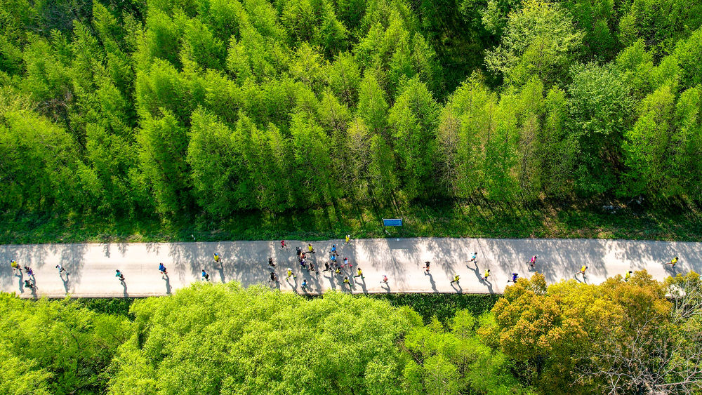 ↑4月6日,在浙江省湖州市长兴县吕山乡胥仓村,跑步爱好者奔跑在乡村的青山绿水间(无人机照片)。