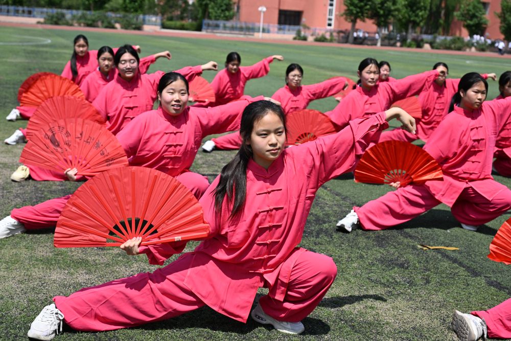 ↑6月17日,山东省青岛市即墨区七级中学学生在练习太极扇。