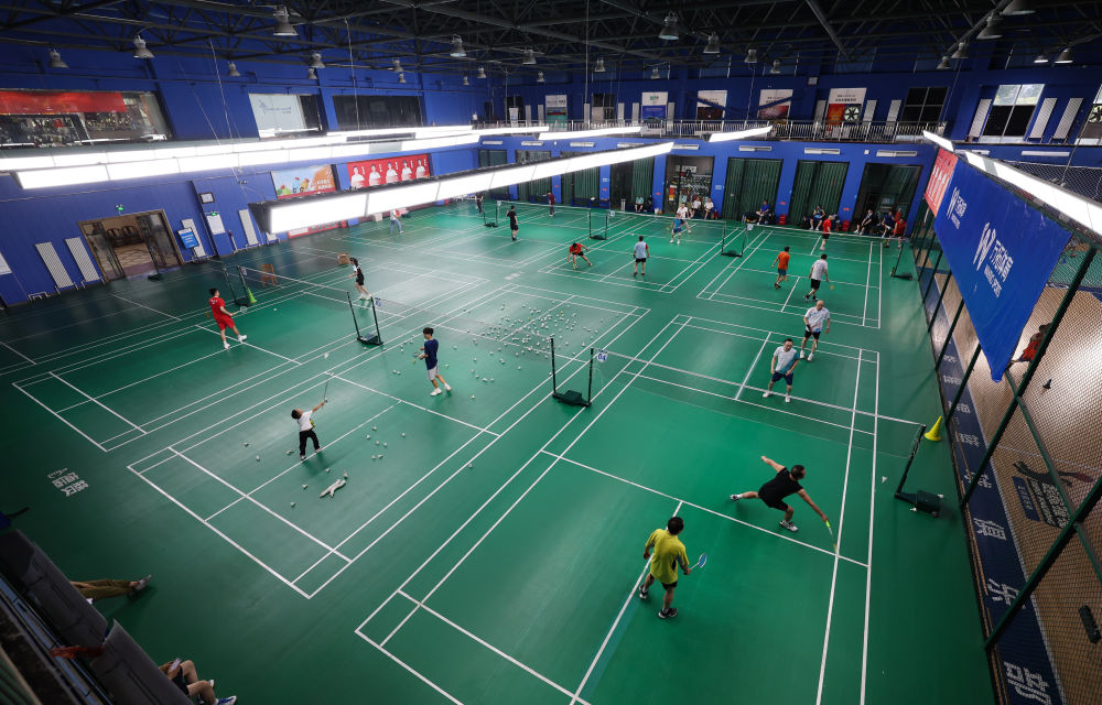 ↑5月15日,人们在河北省石家庄市长安区一家体育健身馆打羽毛球。
