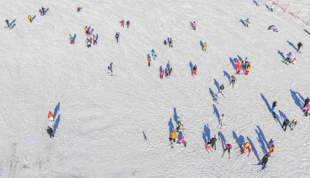 ↑12月7日,游客在河北省唐山市玉田县玉龙湾滑雪场滑雪(无人机照片)。