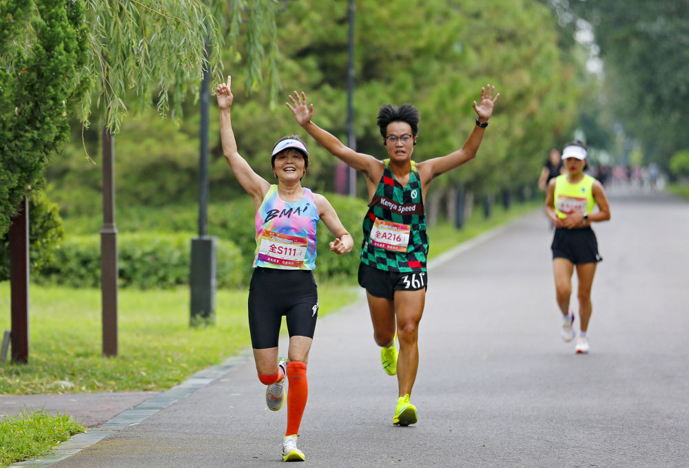 ↑8月10日,参赛选手在山西省临汾市汾河文化生态景区内参加健康长跑比赛。