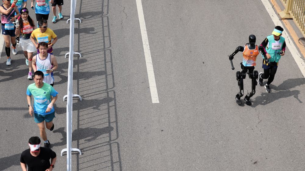 ↑4月19日,参赛选手与天工队选手天工Ultra(右二)在2025北京亦庄半程马拉松暨人形机器人半程马拉松比赛中奔跑。
