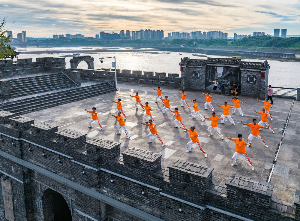 ↑7月24日,健身爱好者在四川省广安市广安区滨江路古城墙段打太极拳。