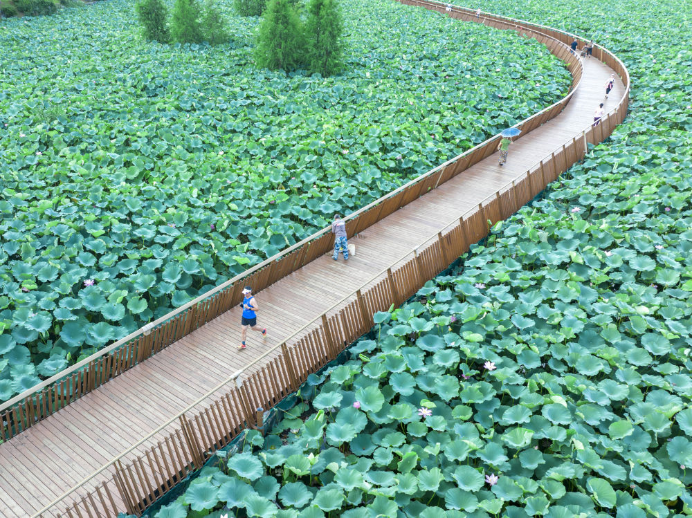 ↑8月8日,市民在江苏省南京市玄武湖公园跑步(无人机照片)。