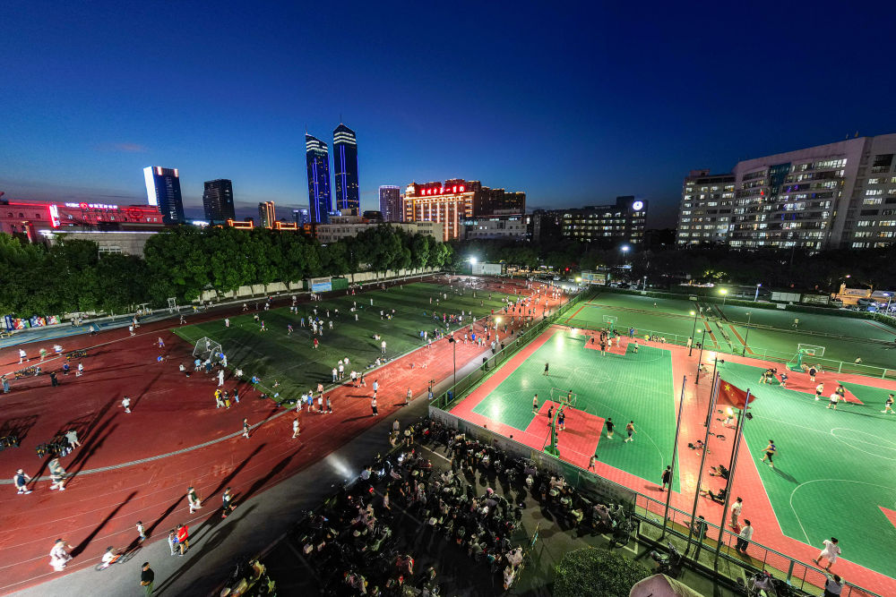 ↑7月2日傍晚,人们在浙江省湖州市全民健身中心健身(无人机照片)。