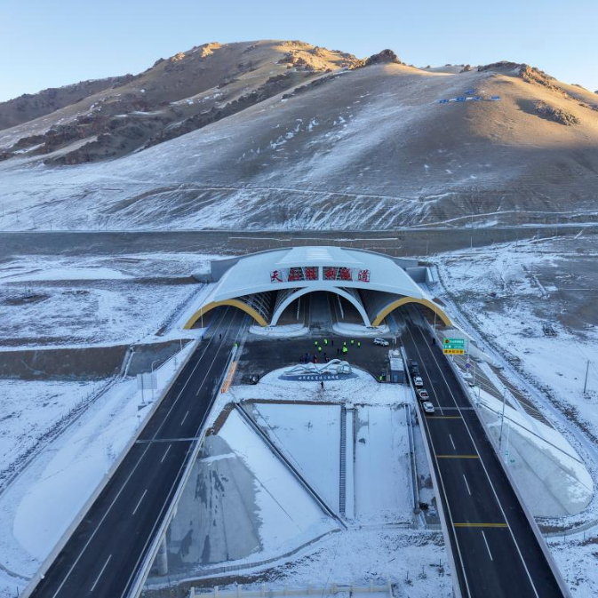 12月26日拍摄的新疆乌尉高速公路天山胜利隧道口(无人机照片)。12月26日上午,世界最长高速公路隧道——天山胜利隧道开始通车,这标志着乌鲁木齐至尉犁的G0711高速公路全线投入使用。新华社记者 胡虎虎 摄