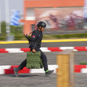2025年9月8日,在新疆乌鲁木齐举行的首届中国—中亚公安内务部门特种警察技能挑战赛上,中国参赛队员谢冬在参与比赛。新华社记者 殷刚 摄