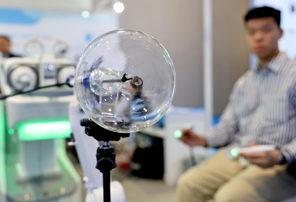 在上海举行的第91届中国国际医疗器械博览会(CMEF)上,工作人员现场通过智能笔对一个全柔性微型内镜手术机器人进行操控演示(2025年4月8日摄)。新华社记者 方喆 摄