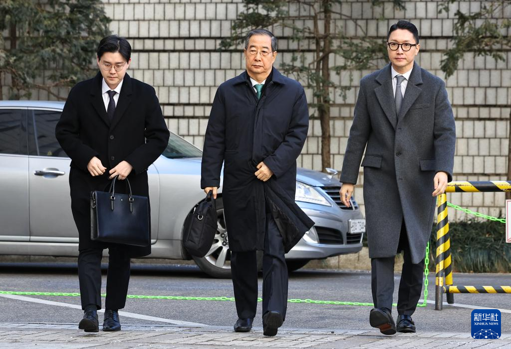 1月21日,在韩国首尔,韩国前国务总理韩德洙(中)准备出席庭审。新华社/纽西斯通讯社