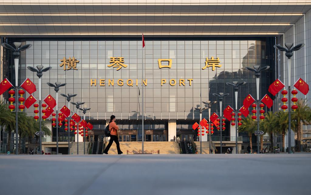 2026年1月13日,一名行人从横琴口岸前经过。新华社发(张金加 摄)