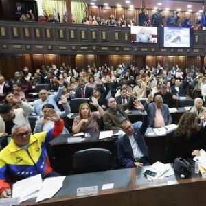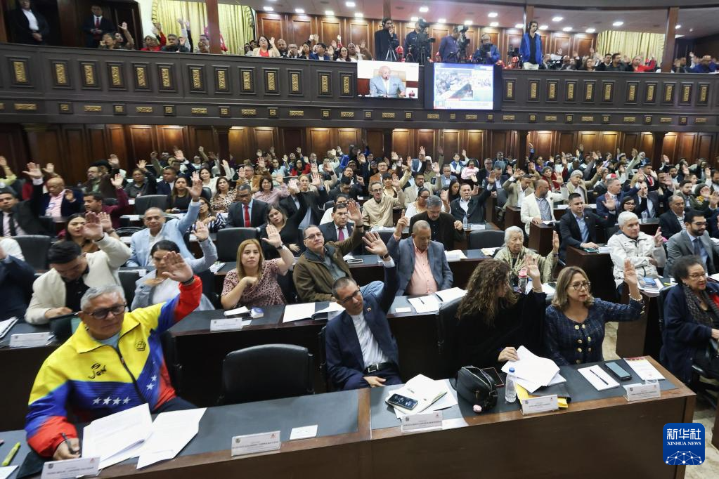 1月29日,在委内瑞拉首都加拉加斯,议员们在委内瑞拉立法机构全国代表大会例行会议上举手表决。新华社发(委内瑞拉全国代表大会供图)