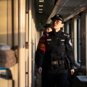在列车上,乘警们会定时巡逻,排查安全隐患。新华社发(杨晓玲 摄)