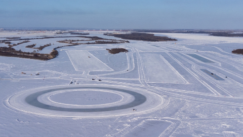 冰面上,十余台作业车辆正紧锣密鼓地维护专用冰道。随后,一辆辆测试车相继驶入,在冰层上疾驰、急刹、甩尾转向,场面蔚为壮观。