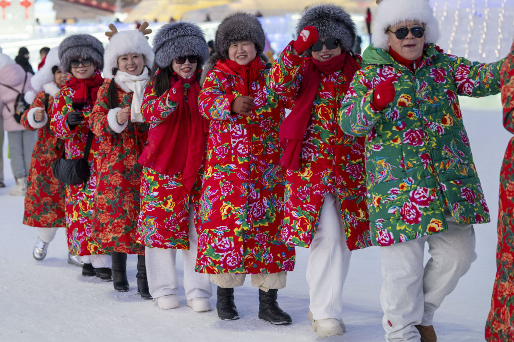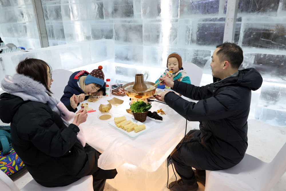 2025年2月9日,来自江苏南通的张先生一家在哈尔滨冰雪大世界品尝冰上火锅。
