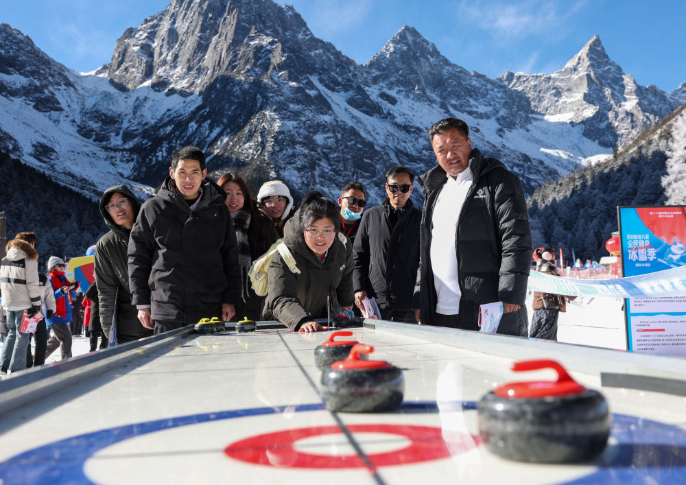 2026年1月5日,游客在理县毕棚沟滑雪场里玩桌面冰壶球。新华社记者江宏景摄