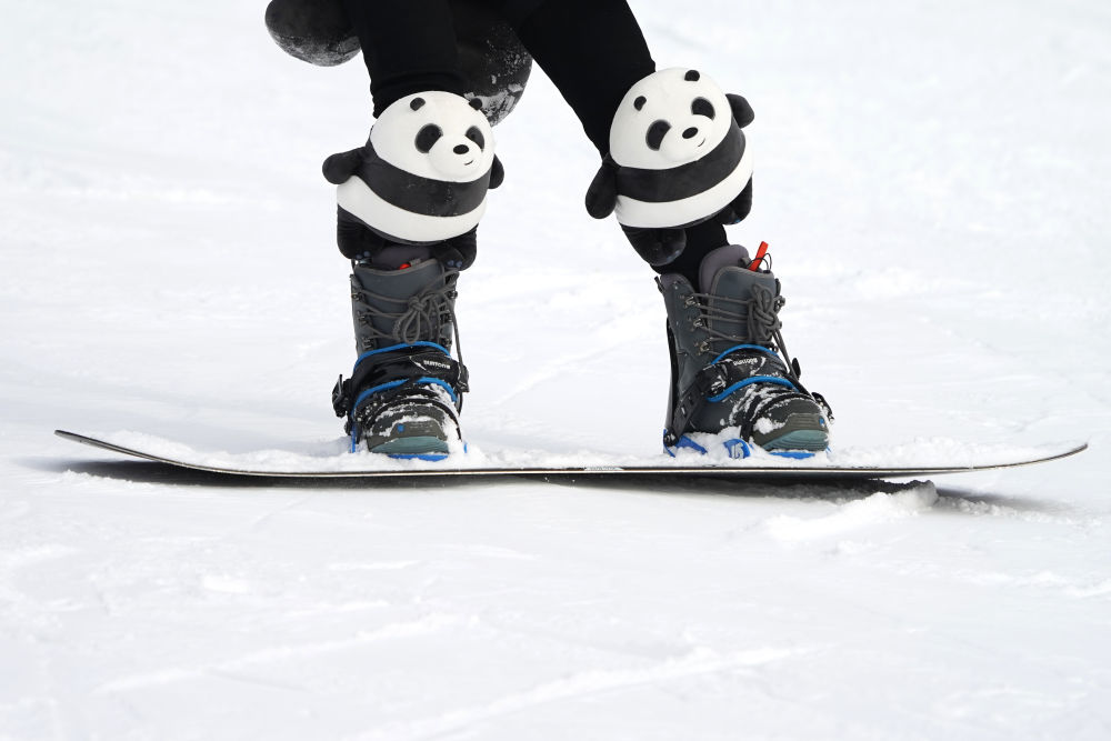 2020年11月28日,一位滑雪爱好者戴着熊猫护膝在北京石京龙滑雪场滑雪。新华社记者鞠焕宗摄