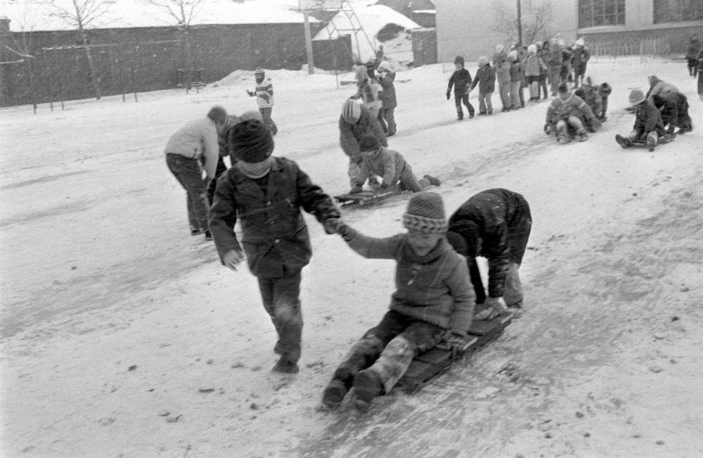 1989年12月31日,黑龙江的孩子们在雪地上玩儿冰车。新华社记者周确摄