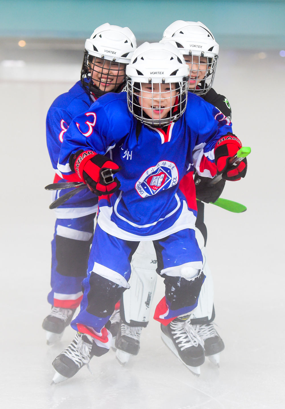 2017年3月12日,广州东山培正小学冰球队的韩铭泽、罗弘皓和林翰飞(从左至右)在广州追风真冰滑冰场进行滑行技巧训练。新华社记者刘大伟摄