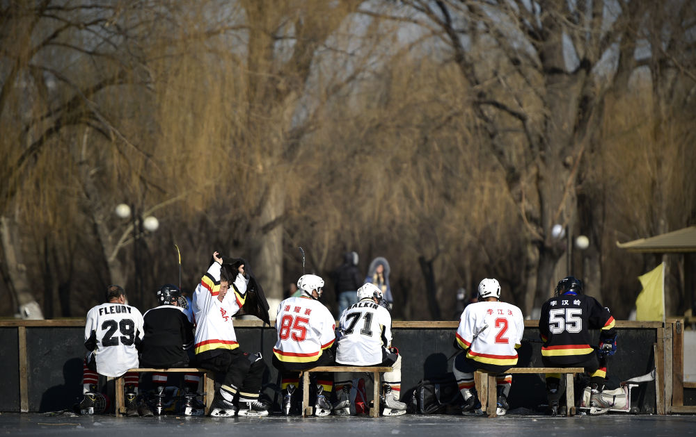 2019年1月17日,辽宁省鞍山市一支老年冰球队队员们在场边休息。新华社记者姚剑锋摄