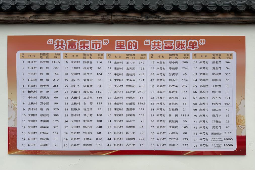 “秀水村村民谢辉,520元”“火田村村民赖银花,1151元”“来苏村村民邓小菊,2436元”……2月2日,记者行走在江西省九江市修水县山口镇的街道上,一面墙上贴的列有72名村民的“共富账单”引人注目。跟着账单,记者来到“共富集市”。