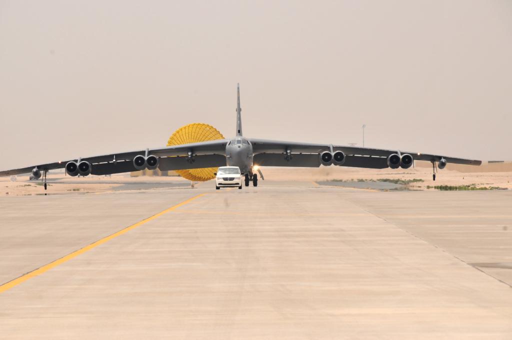 这张资料照片显示的是2016年4月9日,一架美国空军的B-52轰炸机抵达卡塔尔乌代德空军基地。新华社/美联
