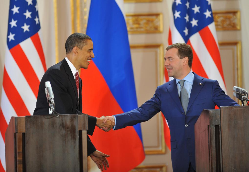 这张拍摄于2010年4月8日的资料照片显示,时任美国总统奥巴马(左)和时任俄罗斯总统梅德韦杰夫在捷克首都布拉格签署新核裁军条约后出席新闻发布会时握手。 新华社记者 武巍 摄