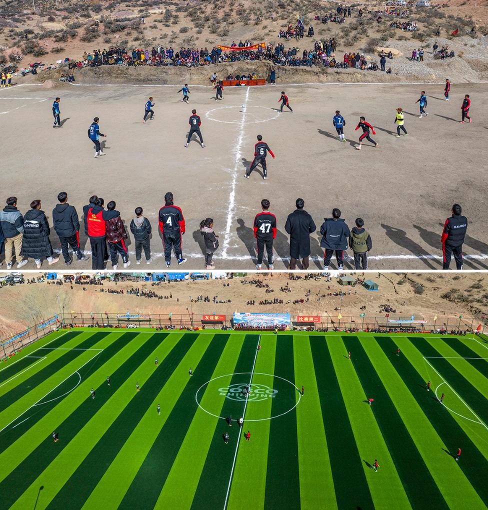 拼版照片:上图为球员在马利镇马利村“爸爸修的足球场”上比赛(2024年1月21日摄)。新华社记者 孙非 摄;下图为球员在马利镇“云上球场”比赛(2025年1月2日摄)。新华社记者 丁增尼达 摄