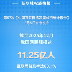 第57次《中国互联网络发展状况统计报告》2月5日在京发布。报告显示,截至2025年12月,我国网民规模达11.25亿人,互联网普及率达80.1%,数字发展成果惠及更广泛群体。生成式人工智能用户规模达6.02亿人,应用场景向生活、生产领域深度渗透。