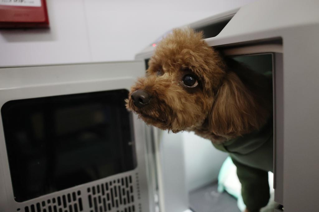2月1日,在中铁快运兰州西站营业部宠物交接区,一只小狗进入高铁宠物运输专用箱等待托运。新华社记者 陈斌 摄