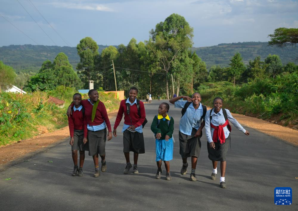 2月3日,在肯尼亚西部的尼亚米拉郡,放学的学生们走在柏油乡村公路上。 新华社记者 杨光 摄