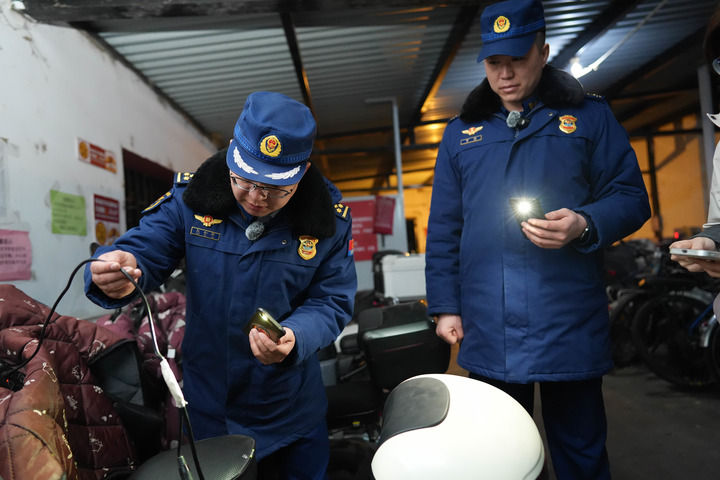 2月3日,消防站副站长王会军(左)和消防员贾超(右)在双榆树南里小区的电动车停车棚检查充电安全。新华每日电讯记者 谢晗 摄