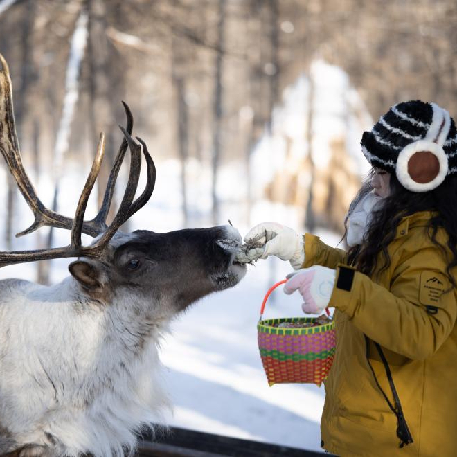 1月15日,游客在根河市敖鲁古雅鄂温克民族乡喂驯鹿。新华社记者 贝赫 摄