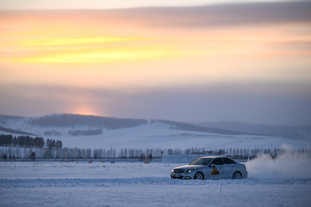 1月19日,在内蒙古呼伦贝尔市牙克石市冰途专业汽车测试基地,车手驾驶车辆高速行驶。新华社记者 贝赫 摄