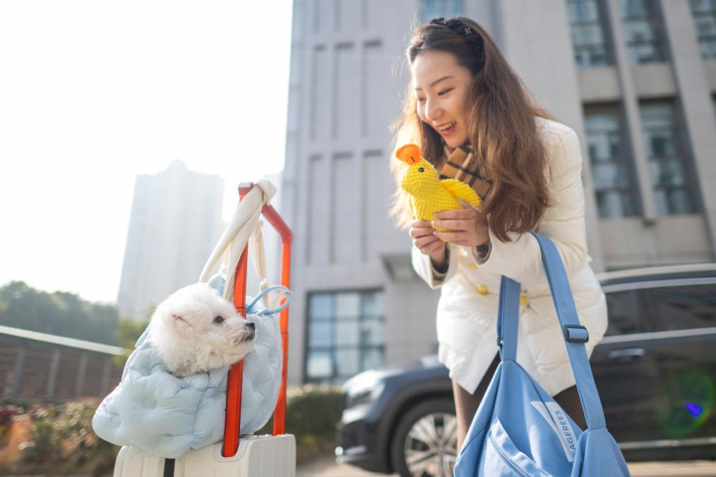 2月2日,在湖北省武汉市,焦思勤出发前与宠物狗“哈尼”互动。焦思勤在湖北武汉工作,老家在河南漯河,今年她选择带宠物自驾回家过年。