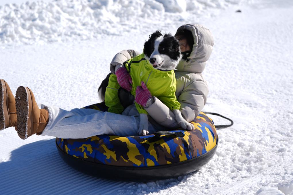 2月7日,在北京渔阳·宠趣里宠物滑雪主题乐园,一名游客带着宠物狗一起坐雪圈参加雪地保龄球趣味游戏。